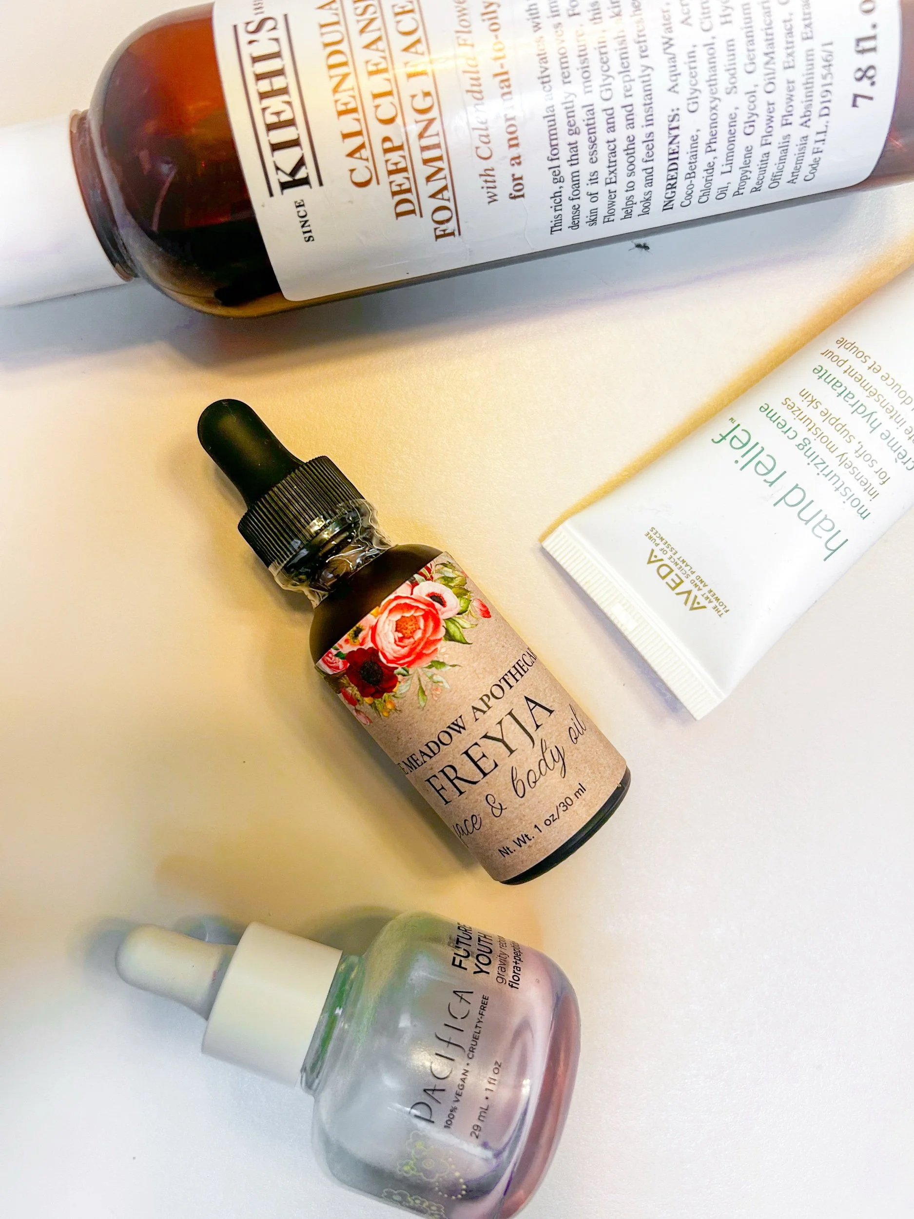 Inspired by Norse goddess of love and beauty, Freyja, this liquid amber is a mix of nourishing oils and skin-soothing herbs intended to moisturize, soften and promote your inner glow. Featuring all homegrown herbs, this truly small batch facial oil is only made once a year in the summer when key ingredient St. John’s Wort is in bloom. The herbs included in this oil have been used in traditional skin care preparations for centuries. We use a multi-extraction method to get the most benefit from the herbs, including a solar infusion process in the midsummer sun. FREYJA is recommended for your nighttime beauty rituals as the last step in your routine or combined with your moisturizer. This product is free of essential oils to keep it safe for sensitive skin. Apply a few drops to face and neck, massaging slowly and gently. Also wonderful as a body oil, addition to a bath, or tool for beauty magic.